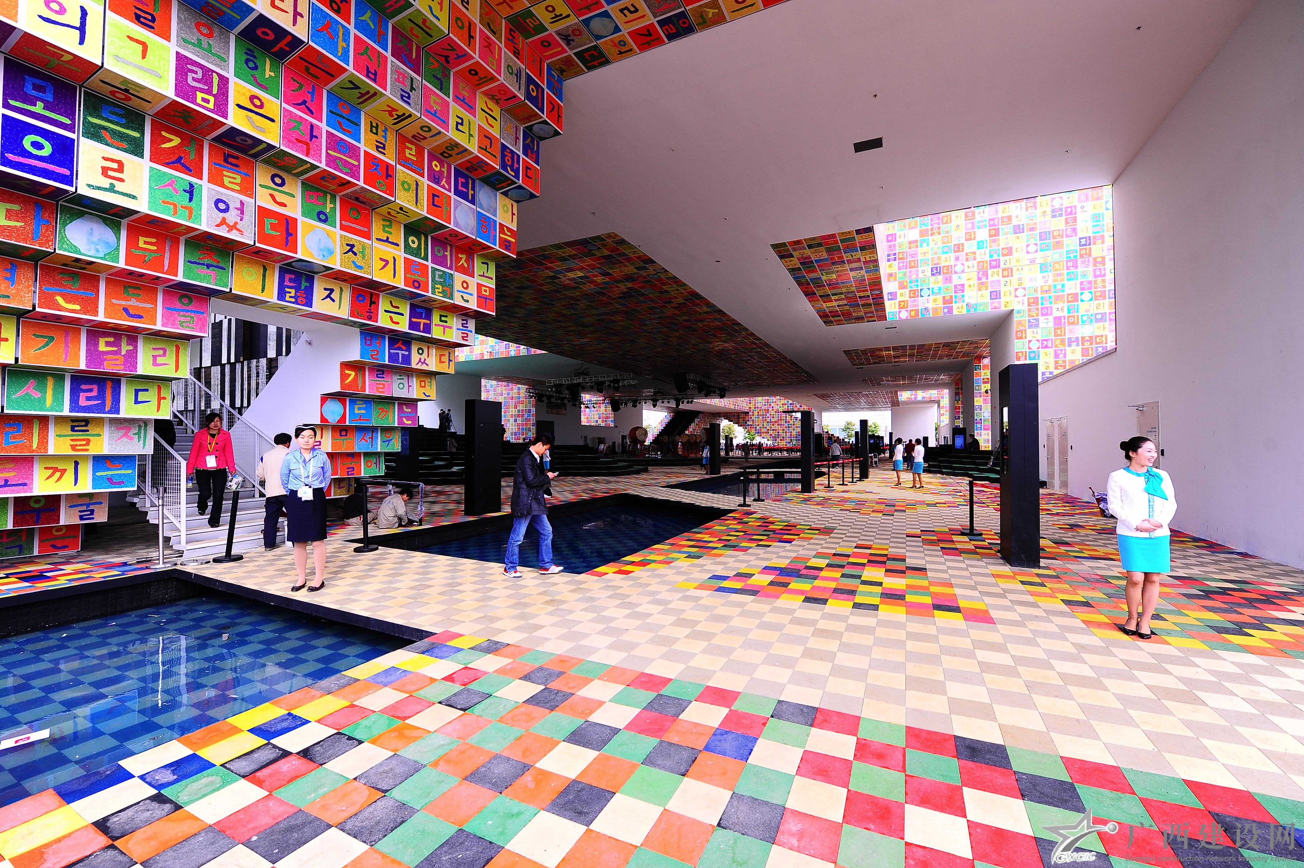 中國2010年上海世博會韓國國家館,位于世博園A片區,國家館由于使用韓文字母構筑,其底層的絕大部分為開放空間,也就是說沒有門,以充分體現韓國的開放性和包容性。展館底層地面,鋪設了不同色彩的地磚。據介紹,色彩斑斕的地面其實是韓國首都首爾地圖,這張地圖為首爾實際面積的1/300。濃縮的首爾移植到了上海,其嶄新的符號化空間,為上海與首爾之間的直接交流建立起一個全新的平臺。