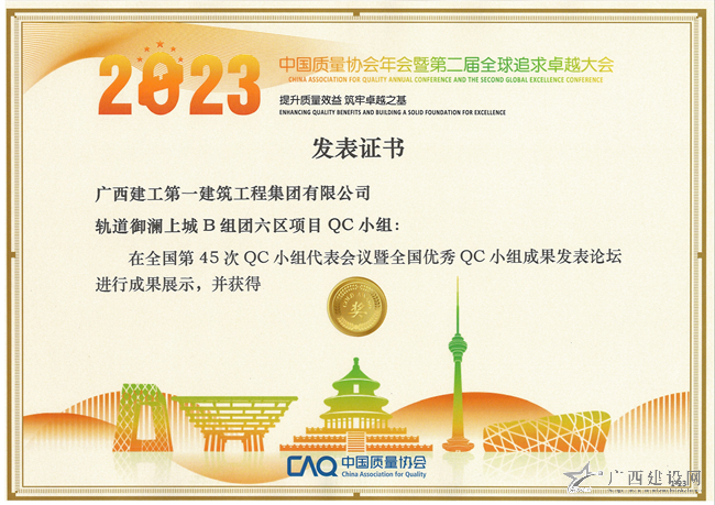 近期,2023中國質量協(xié)會年會暨第二屆全球追求卓越大會在北京舉行,大會同期舉辦了全國第45次QC小組代表會議暨全國優(yōu)秀QC小組成果發(fā)表論壇。廣西建工第一建筑工程集團有限公司(簡稱“廣西建工一建集團”)軌道御瀾上城B組團六區(qū)項目QC小組活動課題《降低砌筑工程普通混凝土小型砌塊損耗率》(成果整理:林姍,發(fā)布人:鄧斌)脫穎而出,獲得本次大賽最高獎項——金獎。這是廣西建工一建集團首次登上中國質量協(xié)會“全國QC小組代表會議暨全國優(yōu)秀QC小組成果發(fā)表論壇”的舞臺進行成果展示,并獲得國內質量管理小組領域的最高獎,實現了里程碑式的突破!