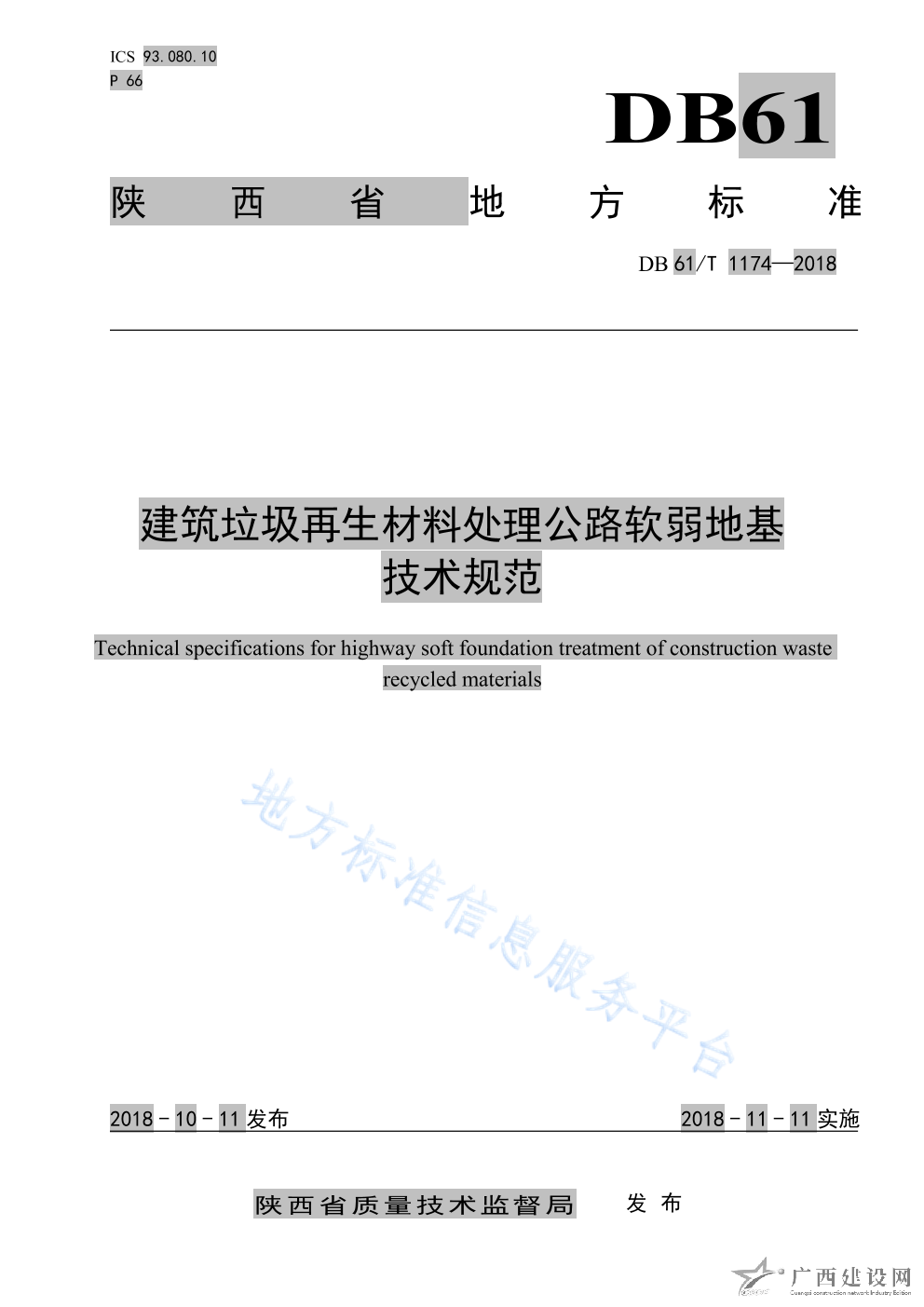 DB61 T1174-2018建筑垃圾再生材料處理公路軟弱地基技術規范