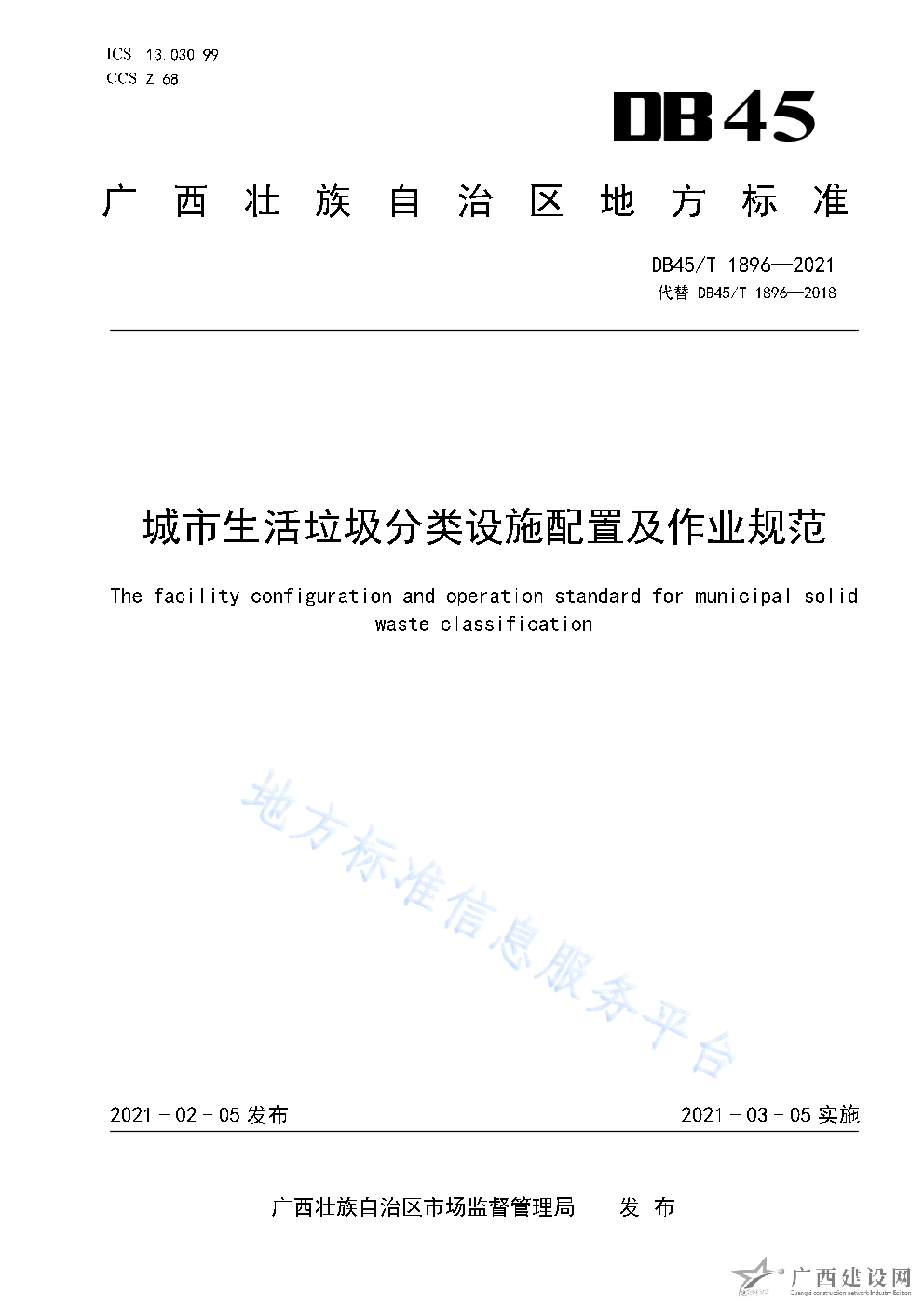 DB45T 1896-2021城市生活垃圾分類設施配置及作業規范