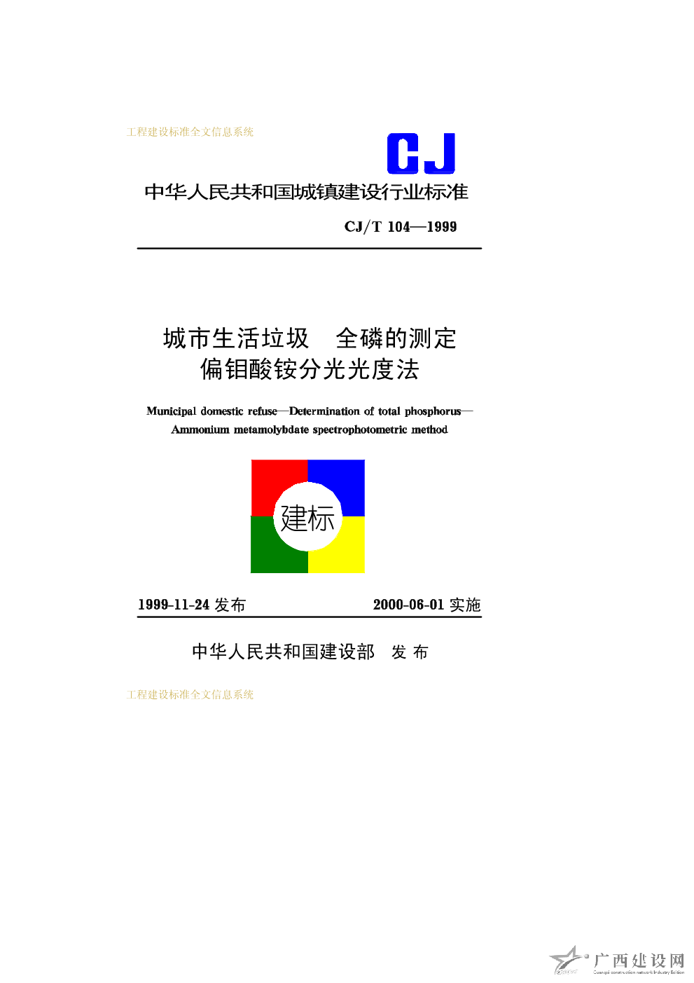 城市生活垃圾全磷的測定偏鉬酸銨分光光度法 CJ/T104—1999