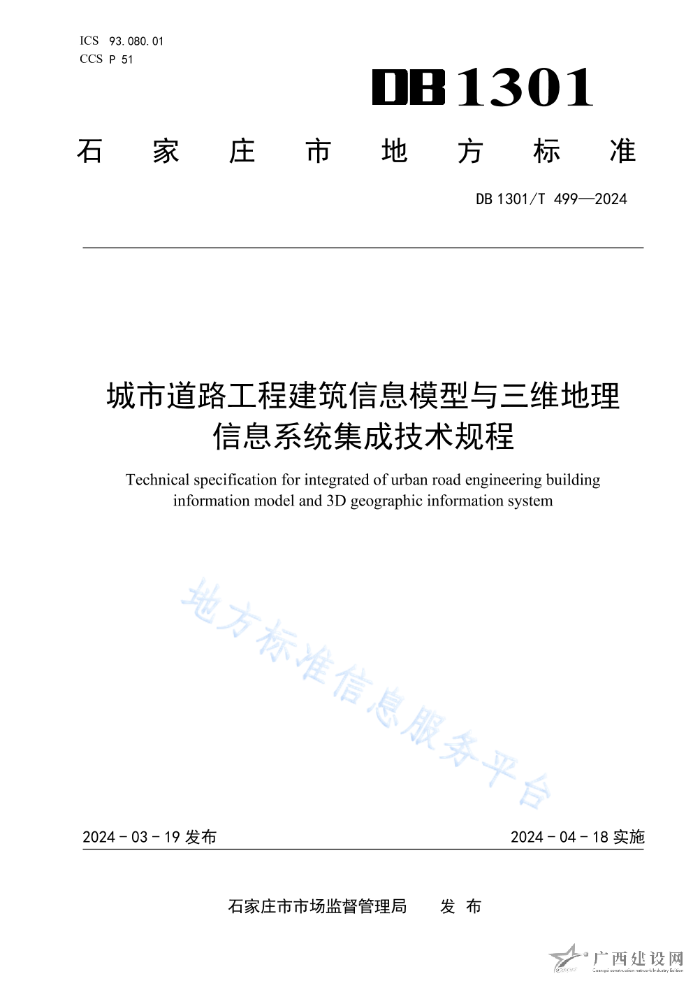 DB1301_T+499-2024+城市道路工程建筑信息模型與三維地理信息系統集成技術規程(石家莊市市場監督管理局)