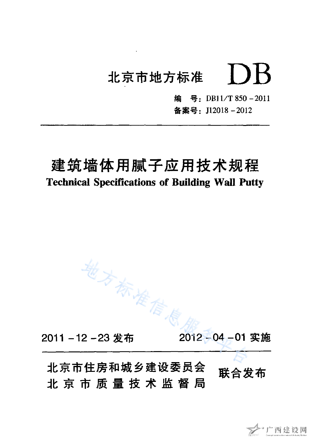 DB11 T_850-2011_建筑墻體用膩子應用技術規程