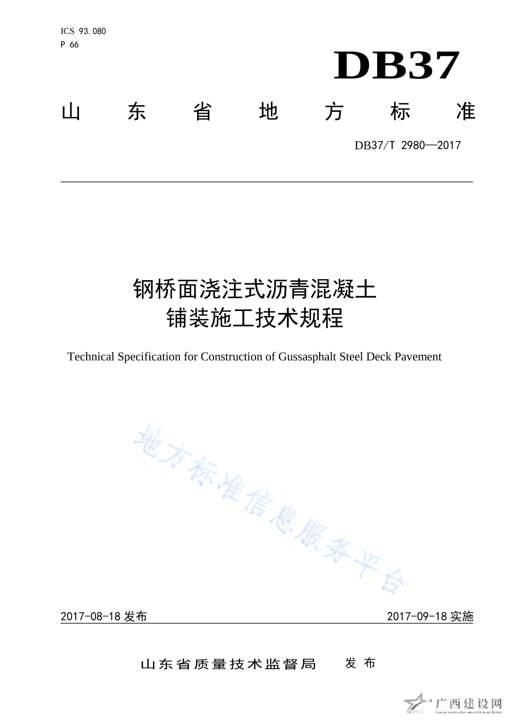 DB37 T2980-2017鋼橋面澆注式瀝青混凝土鋪裝施工技術規程