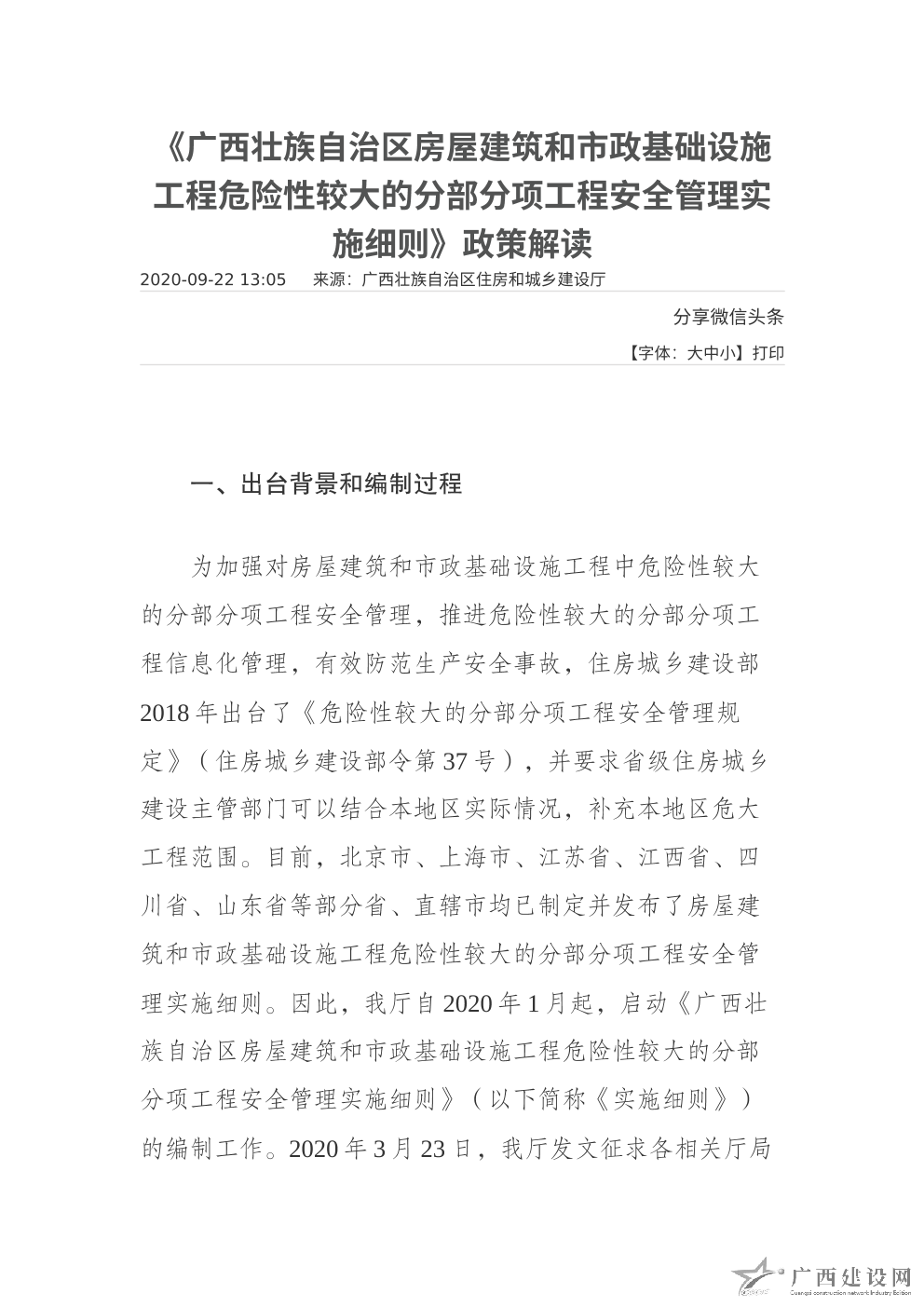 《廣西壯族自治區(qū)房屋建筑和市政基礎(chǔ)設(shè)施工程危險(xiǎn)性較大的分部分項(xiàng)工程安全管理實(shí)施細(xì)則》政策解讀