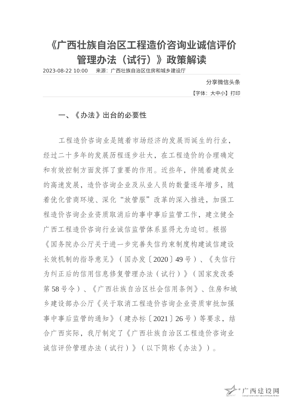 《廣西壯族自治區(qū)建筑業(yè)企業(yè)誠信綜合評價辦法》(試行)政策解讀材料