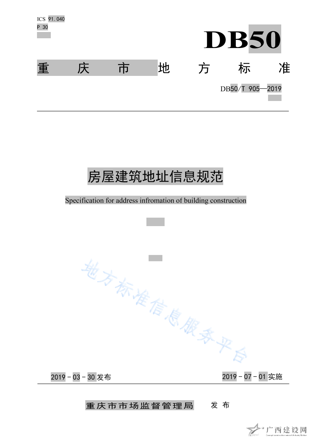 DB50 T905-2019房屋建筑地址信息規(guī)范
