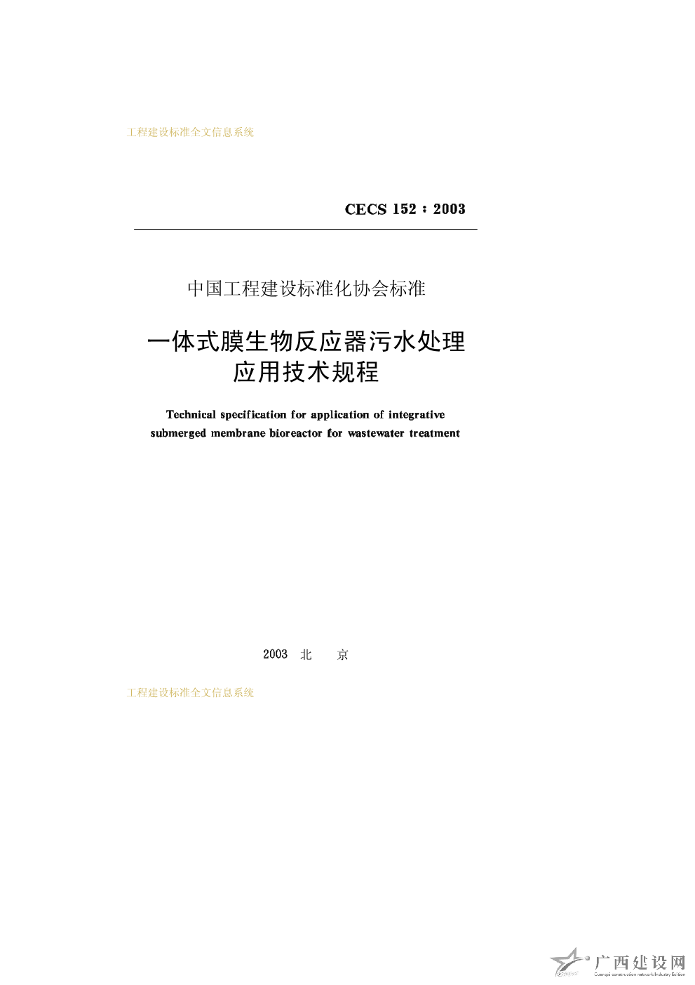 一體式膜生物反應(yīng)器污水處理應(yīng)用技術(shù)規(guī)程 CECS152∶2003
