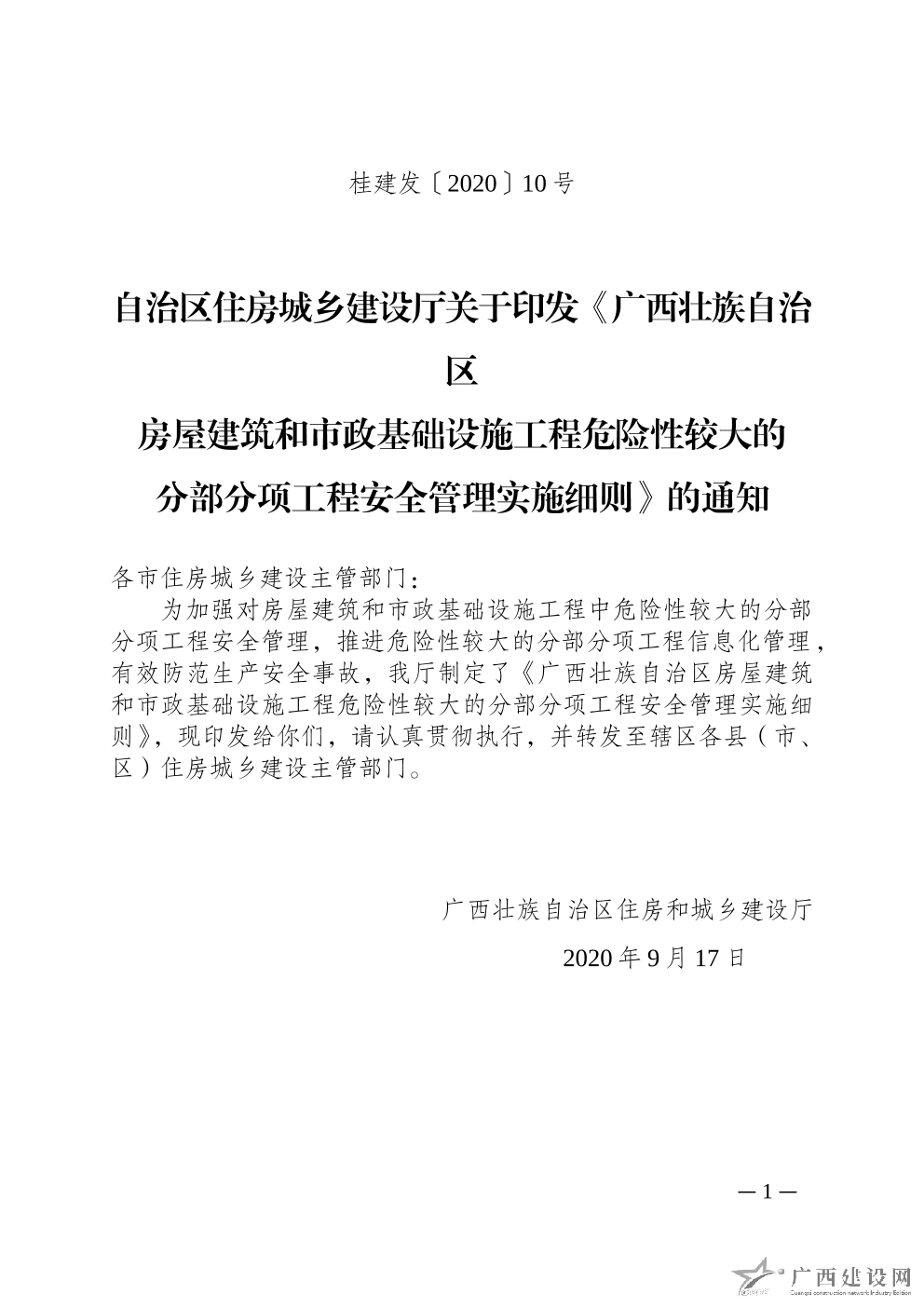 《廣西壯族自治區(qū)房屋建筑和市政基礎(chǔ)設(shè)施工程危險性較大的分部分項(xiàng)工程安全管理實(shí)施細(xì)則》(桂建發(fā)【2020】10號)的通知